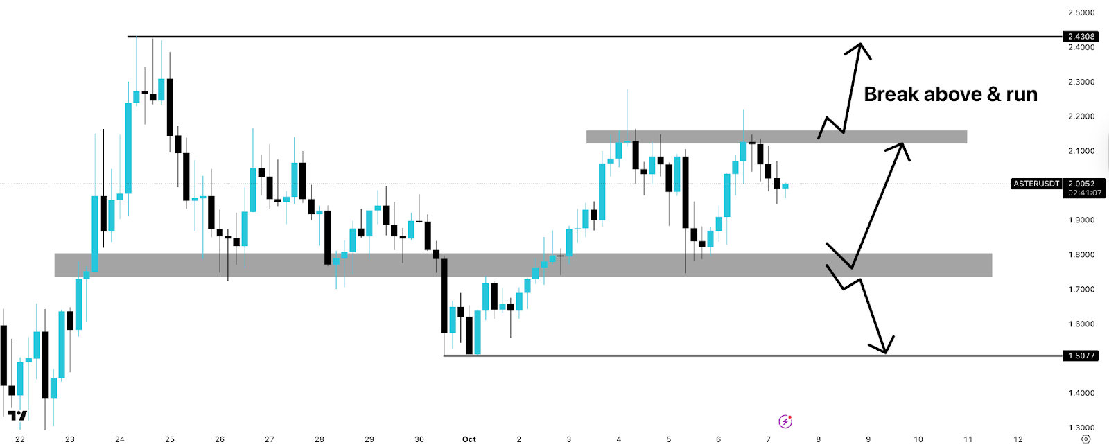 Aster has formed a trading range between $1.80 and $2.15. This means it is consolidating between support and resistance while the next move brews.