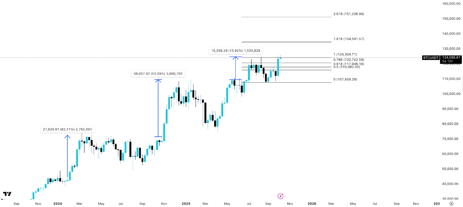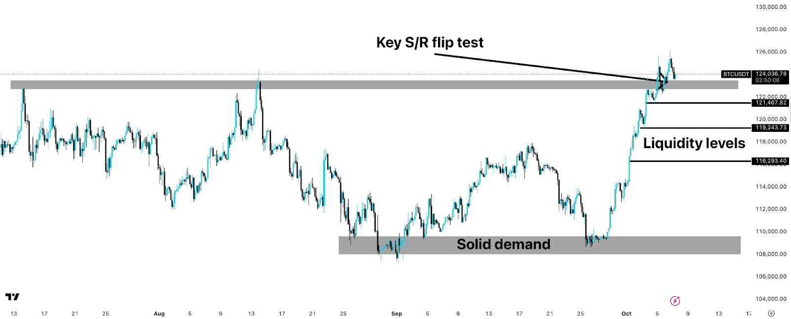 Good morning! Bitcoin has kicked off Q4 with fireworks, printing new all-time highs on consecutive days and setting the tone for what could be a historic month. After breaking through resistance last week, BTC is now testing a crucial support and resistance (S/R) level around the highs, a move that could confirm this zone as a fresh bid area and lay the foundation for the next leg up.