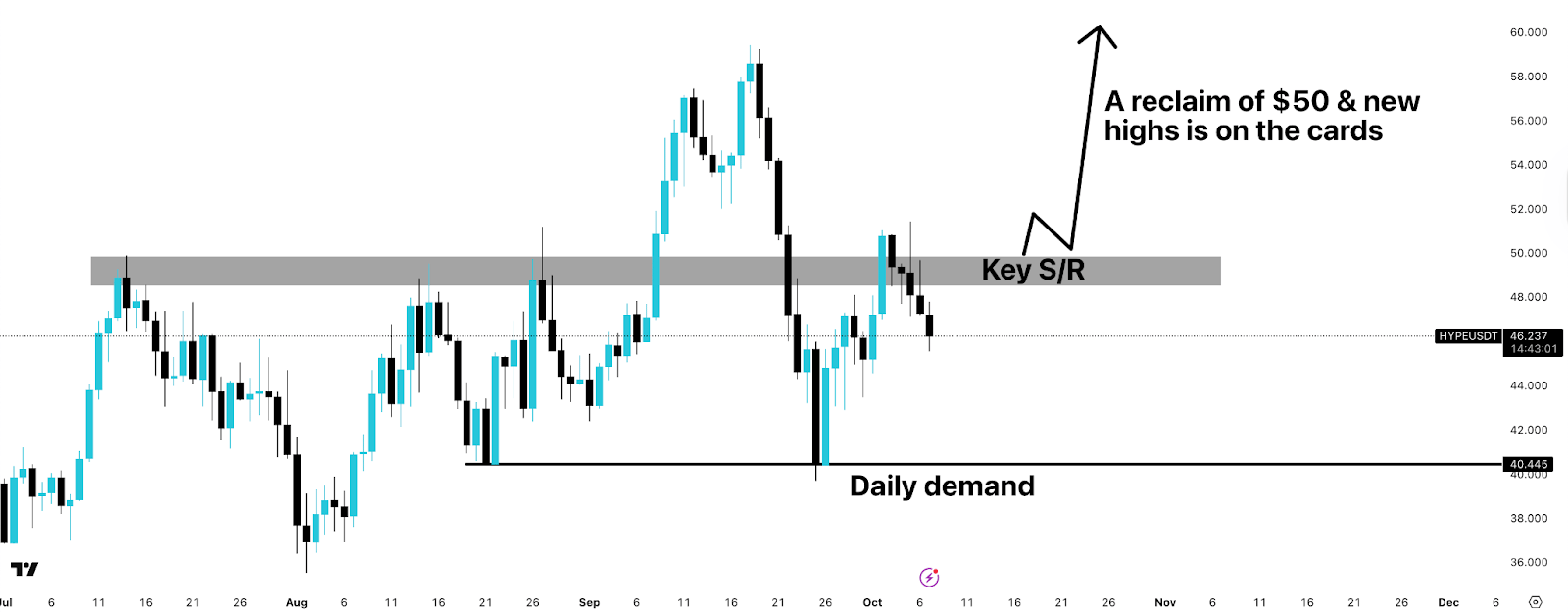 Hyperliquid is witnessing similar price action. It is stuck between key S/R and demand, while the fun begins should it get above.