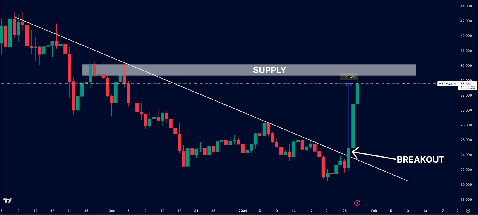 HYPE is up 52% this week and did edge slightly higher as it rammed into supply. This region, in and around $35, will be a huge test for the price.