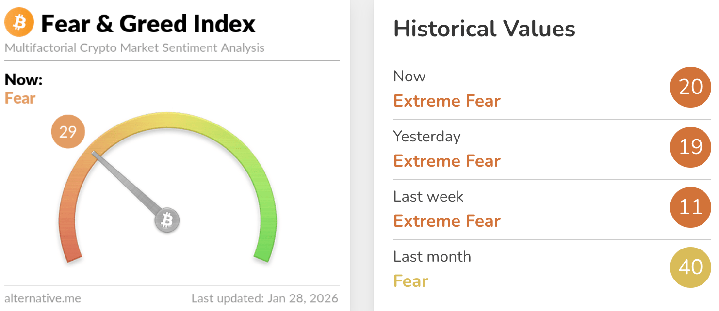 The Fear and Greed Index remains unchanged and within the Fear segment, scoring 29.