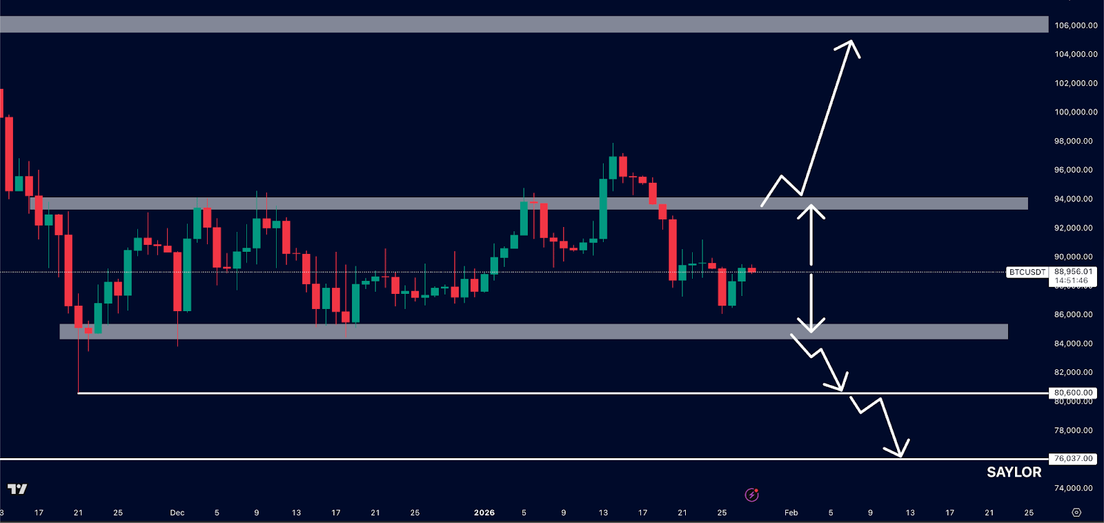 The real meaning behind bitcoin’s price action will begin once it breaks above or below the range. This will result in a push towards $100,000+ or a drop to $80,600 and then potentially Saylor’s entry at $76,000.