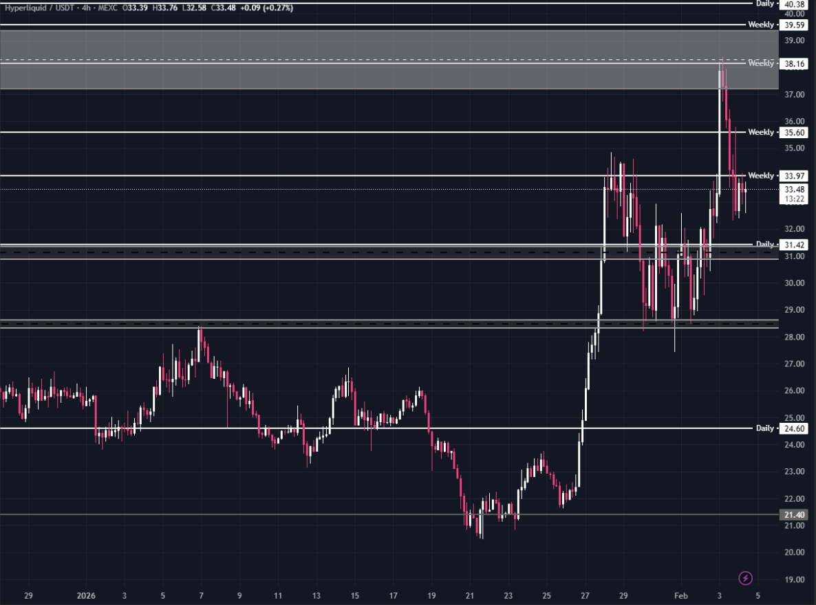 In a week where prices have been in decline and chaos has prevailed in traditional finance, one crypto name has stood out above the rest. HYPE, the native token for L1 dex Hyperliquid has been an immense performer, soaring 87% from its lows. The long from $21.40 was glorious, and then a secondary scalp from $27.50 last week (for those in the Discord) was a great move. The token respected our levels and cooled off following the run.