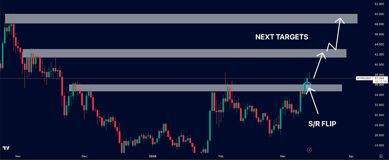 Hyperliquid is an outlier in this market as it has already broken out of resistance and appears to be confirming an S/R flip.