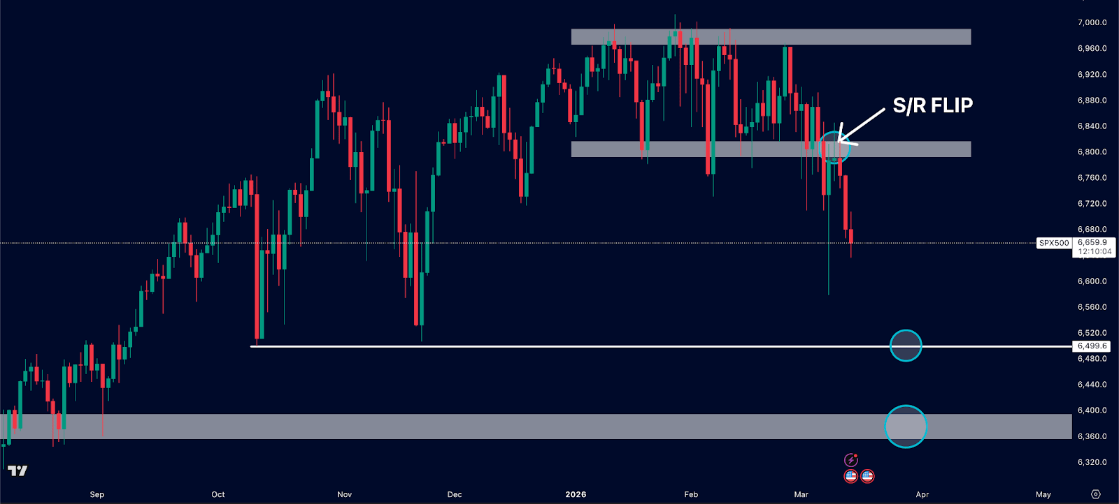 The S&P has already put in an S/R flip, with previous support now acting as resistance.