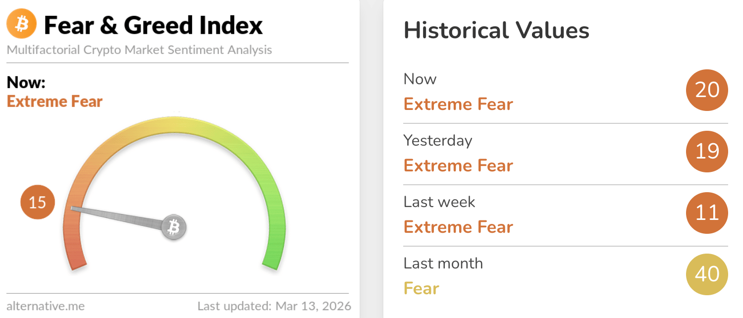 The Fear and Greed Index remains low, at just 15. This means it is still deep within Extreme Fear despite bitcoin’s low time frame upturn.