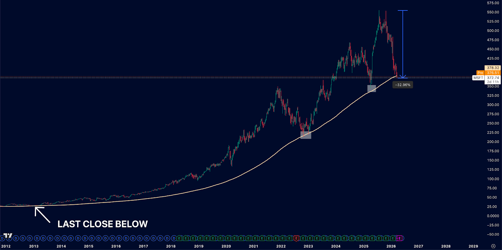 The last time MSFT closed below its 200WMA was back in late 2012, almost 14 years ago, giving this week's candle huge significance.