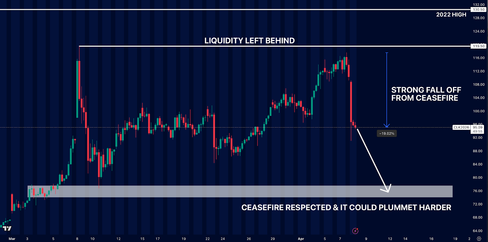 If the ceasefire is respected for the full two weeks, it gives plenty of runway for risk markets like crypto and stocks to rally while oil tumbles.